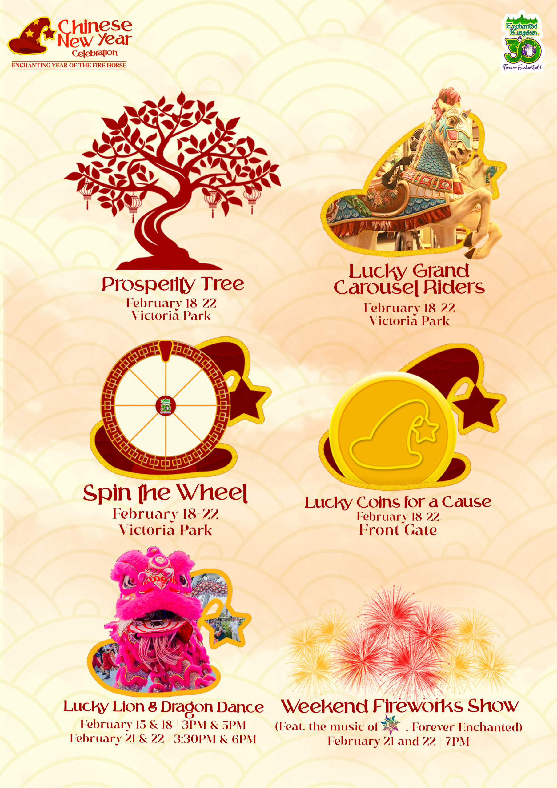 This will be highlighted by the Prosperity Tree at Victoria Park, Lucky Lion and Dragon Dance, Spin the Wheel, Lucky Coins for a Cause, and Lucky Grand Carousel Riders.